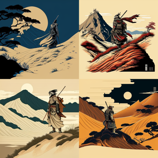 <Ukiyo-e style > style of a warrior is setting on top of the dune mountain