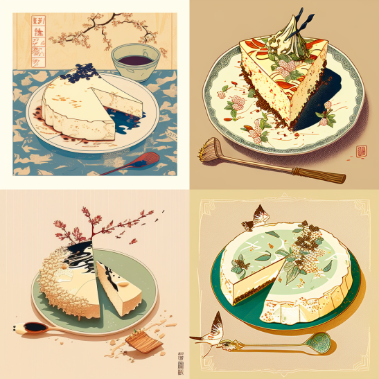 <Ukiyo-e style > style of a bitten white cheesecake and crumbles with a bird's footprint, a pretty plate, on the table, ultra detailed